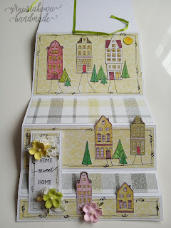 wiosna coś się na razie nie spieszy, ale mnie powoli ogarnia wiosenno-wielkanocny nastrój. Kartka schodkowa, która po złożeniu ma wymiar 10 x 15 cm. Bazę wycięłam i zbigowałam samodzielnie. Wykorzystałam papiery z zestawu Angel girls Craft o'Clock oraz wycięte z pasków domki, które były gratisem do zamówienia (ale którego? kto by spamiętał?). Dodałam trochę drzewek i słoneczko pomalowanych markerami Touchfive, gazę, kwiatki DP Craft, kwiatki - gipsówkę, żółte pręciki oraz ramki narysowane czarnym długopisem.